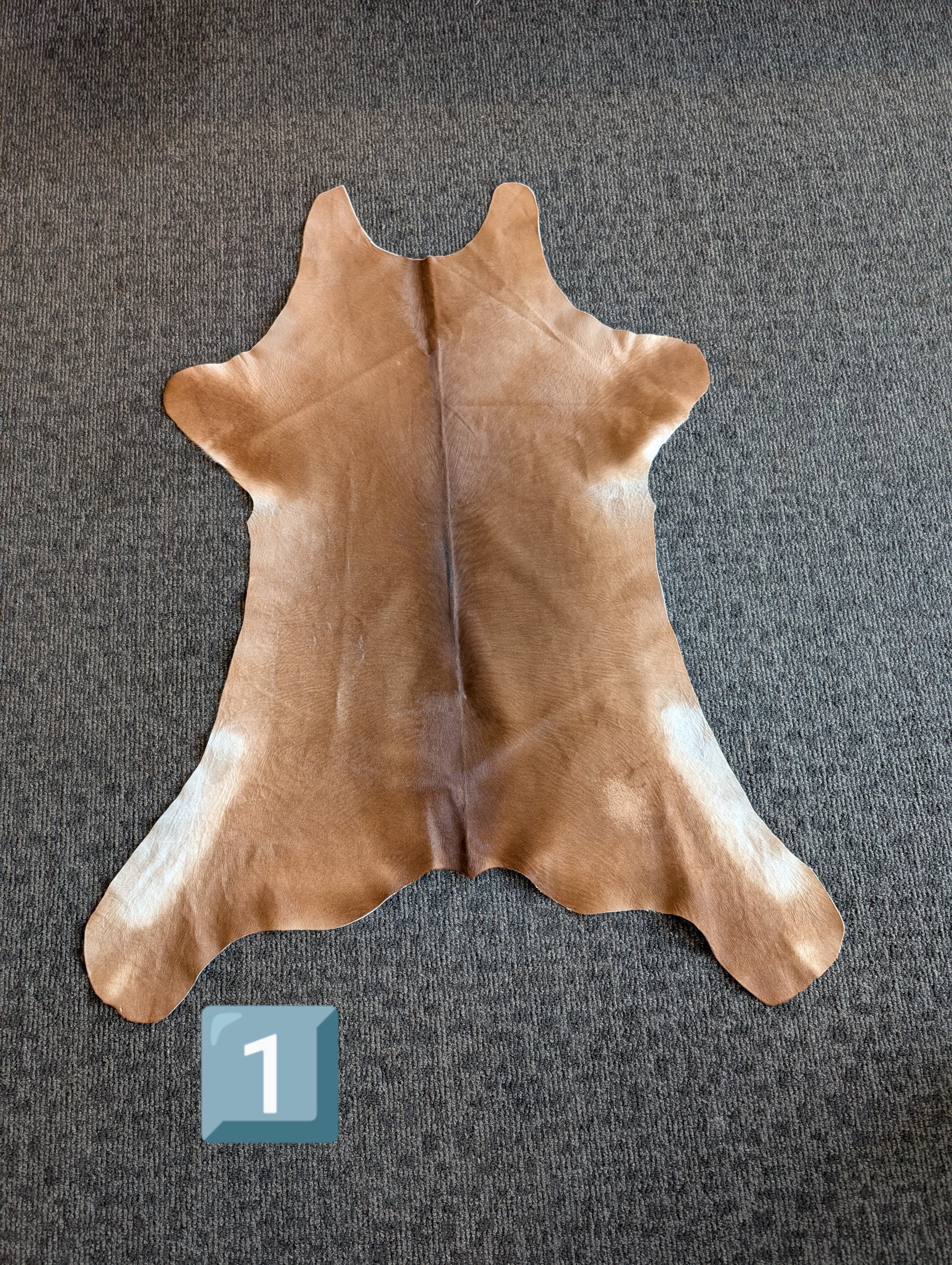 Authentic calfhides. Get the exact hide that you see. Goat hides and full size cowhides are also available.